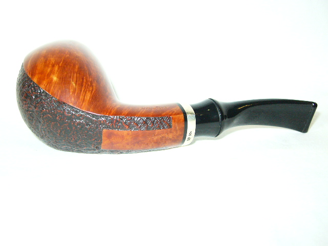 Kiváló minőségű bruyere (Briar, Hanga-gyökér,amit helytelenül rózsafának is fordítanak) gyökérből készült pipafej, melynek baloldala polírozott, jobboldalt rusztikus, 9mm-es filteres, enyhén hajlított szárral. Nagy kazánméretű.