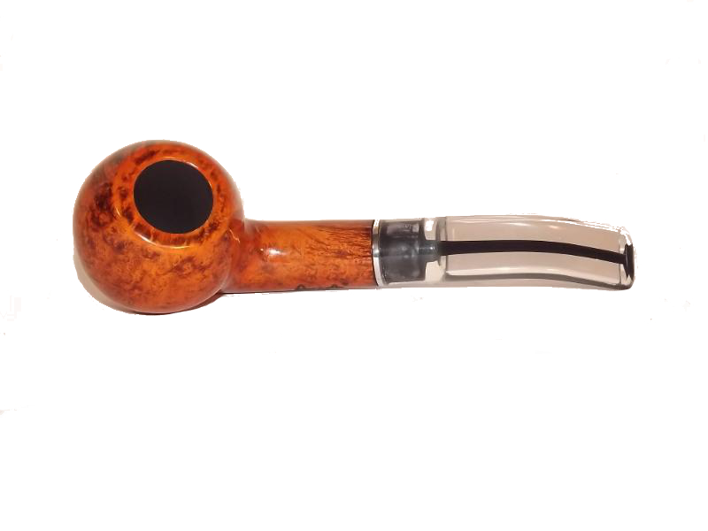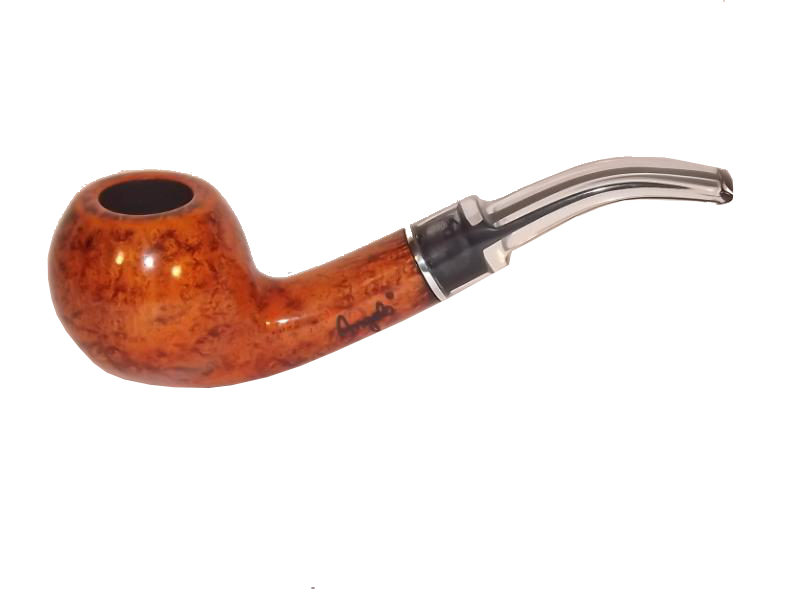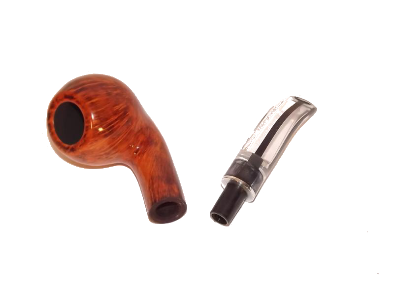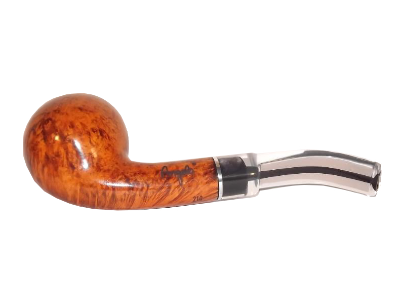 Az Angelo Perlude 210 pipa bruyere gyökérből készült világosbarna, polírozott pipafej, 9mm-es filterrel, hajlított szárral és átlátszó akril szopókával.